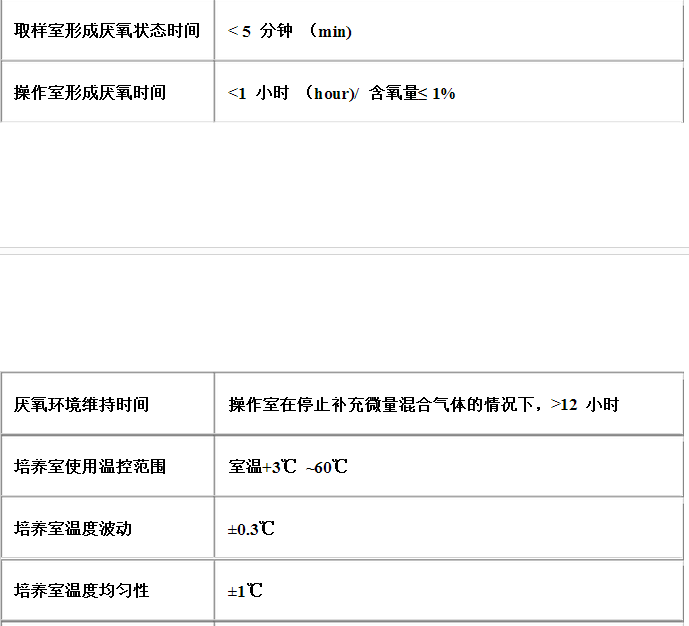(2) 溫度均勻度 ≤±1 ℃培養室溫度范圍 室溫+3℃**60℃。 (3) 溫度波動度 ≤±0.3 ℃ (4) 厭氧等級 含氧量≤1%