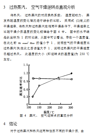于其基本熱力學特性的不同, 在不同的蒸發溫度下會反映出不同的蒸發速率變化規律。 考慮恒速干燥段, 在較低的介質溫度下, 熱風干燥時物料表面溫度和介質的溫度差比過熱蒸汽大許多, 使得在較低溫度時 , 熱風的干燥速度比過熱蒸汽要快;隨著溫度的升高, 這種溫差大所占比例優勢明顯下降;過熱蒸汽的對流換熱系數隨溫度的升高較熱風增長得要快, 抵償了溫差小的劣勢 ;而蒸發單位水分需用的熱量, 過熱蒸汽比同樣條件下的熱風所需的熱量要小。正是這三方面的結合使得逆轉點存在。